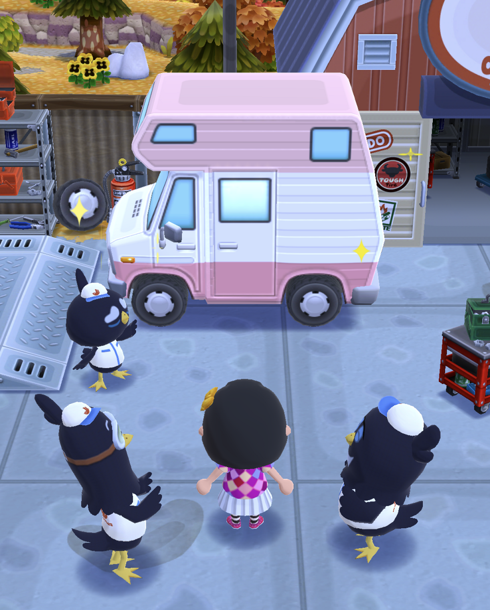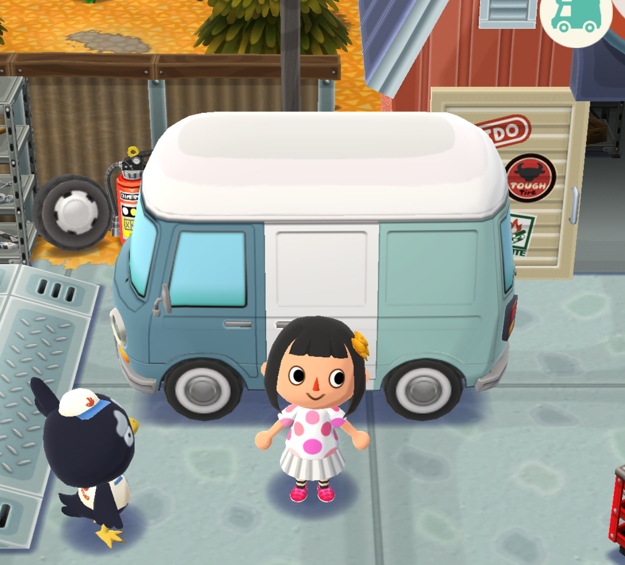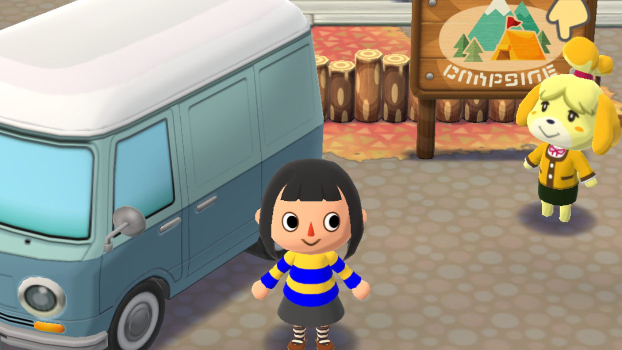 しずえさんのいるお店ひろばの島。懐かしいハリネズミさん。そして、懐かしいたぬきちがいる~!全員とことんキャンパー設定なんですね、どちらもキャンピングカーのお店です。車の中でせっせとミシンがけしているハリネズミさんには声もかけられないけれど、お姉さんかなあ。