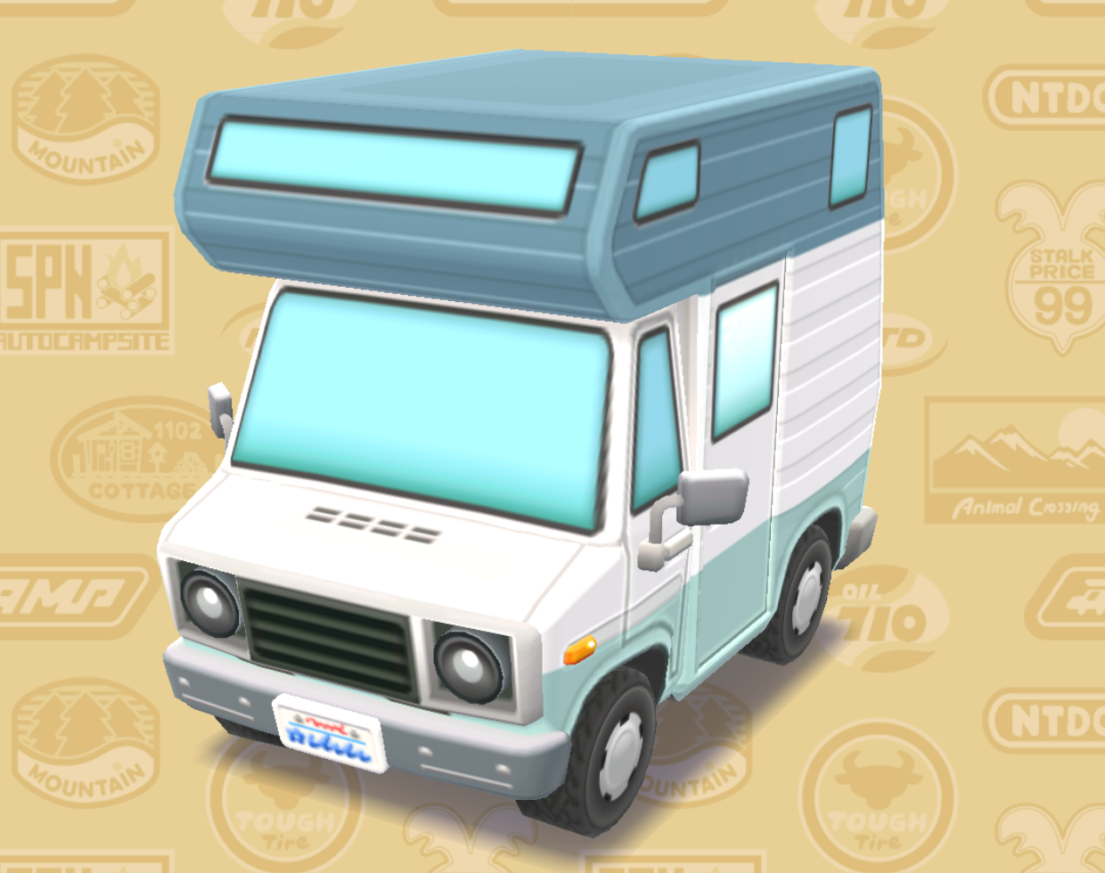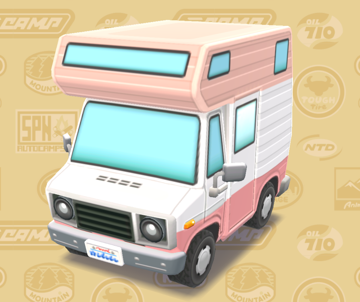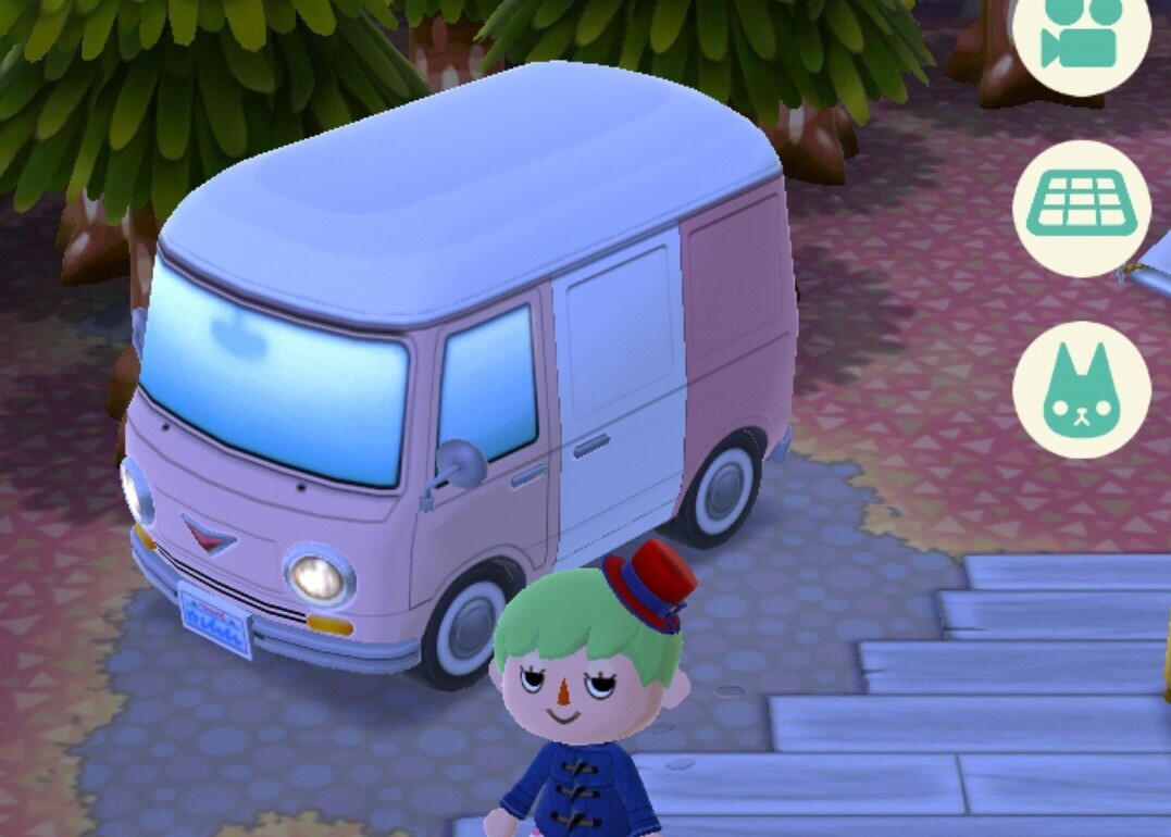 最初のログイン記念撮影。キャンピングカーから降りてきて、ここからどう森キャンプ生活のスタートです。