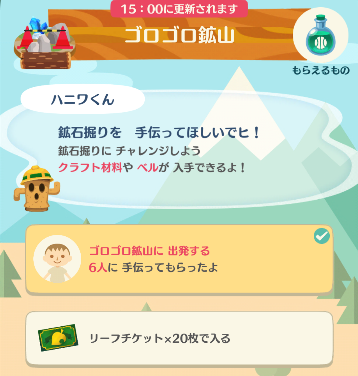 手伝ってもらったよって過去形なので、え?鉱山ってこれでミッション終わりなのかと一瞬びっくり。手伝いは出発限定で、掘るのは一人ぼっちなんですね、たぶん。五人がかりで背中押してもらわないとはじめの一歩を踏み出せないほど鉱山っておそろしいとこなんだわ、きっと。