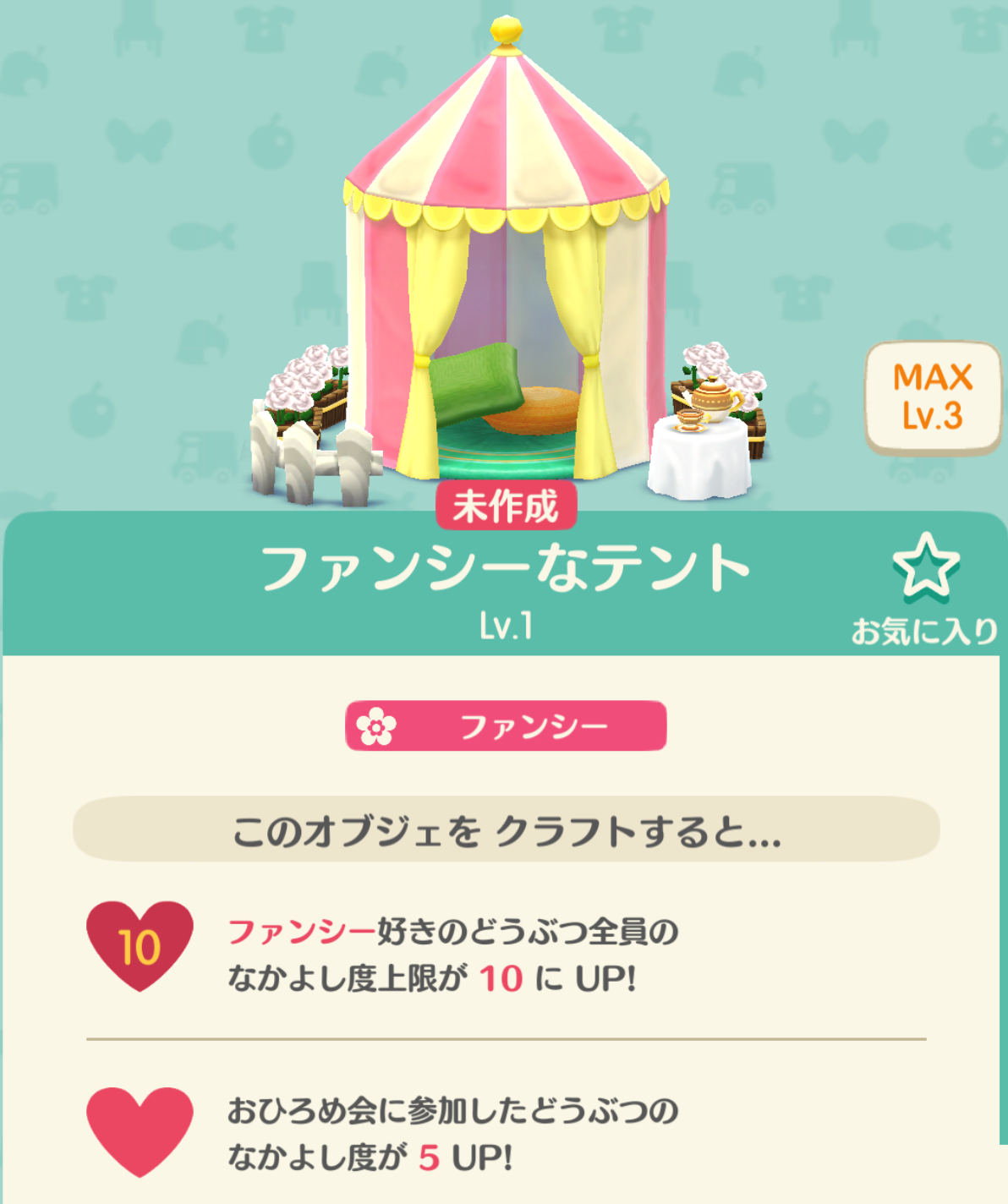 その中からこれ、「ファンシーなテント」を選びました。なになに?なかよし度も上がるの?やったね。テントにはそれぞれ効果がついてるからよく見比べねば・・・って一生懸命見てたらわけわからなくなっちゃった…最後は見た目で決めました。かわいい。