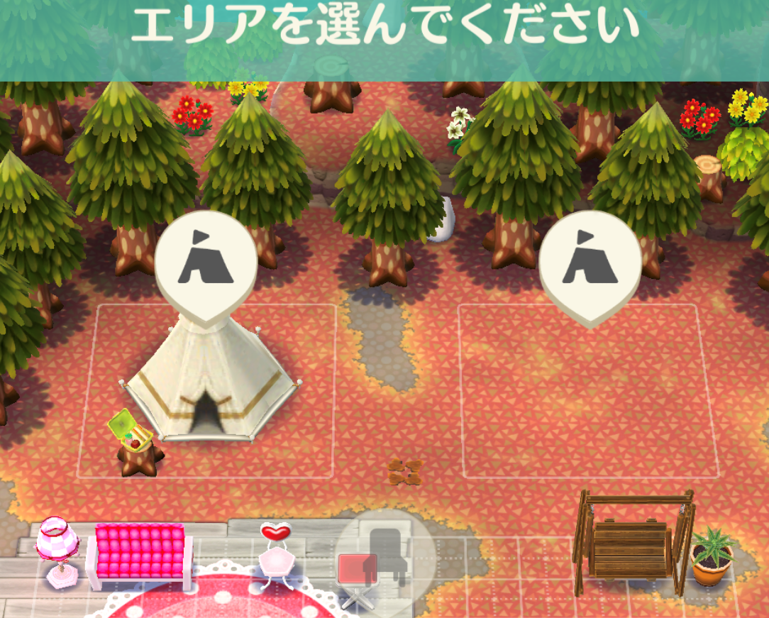へええー、テントは二つもおけるのね。だけど、左側に建てるとすると、最初からあった普通のテントが消えてしまうし、かといって、ファンシーなテントはお部屋ぽい部分に合わせて左側に置きたいし…どうしましょう。