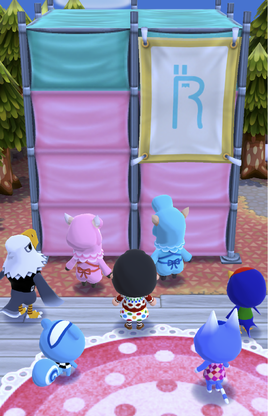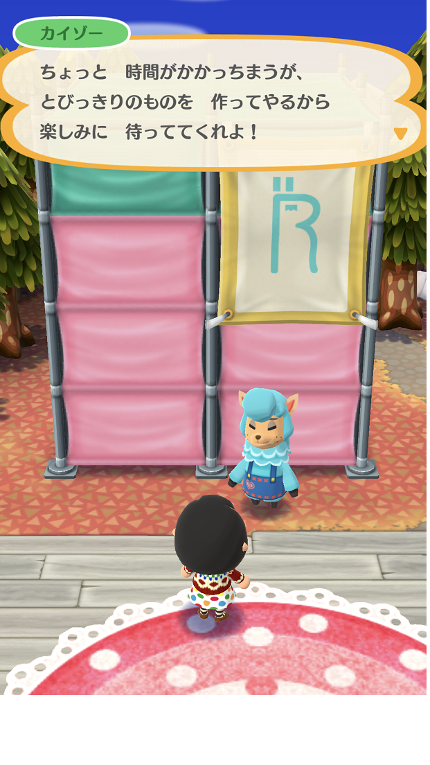 どれくらい待つのかしら?調べたら12時間でした。長いなあ。その間この建築中のシート姿かあ。どう森のものはシートすらもかわいいからいいけども。それに、ロゴの垂れ幕までかかってるじゃありませんか。最初キリンかと思ったけど、これアルパカですよね。制作陣のこだわりと愛情が伝わってきます。